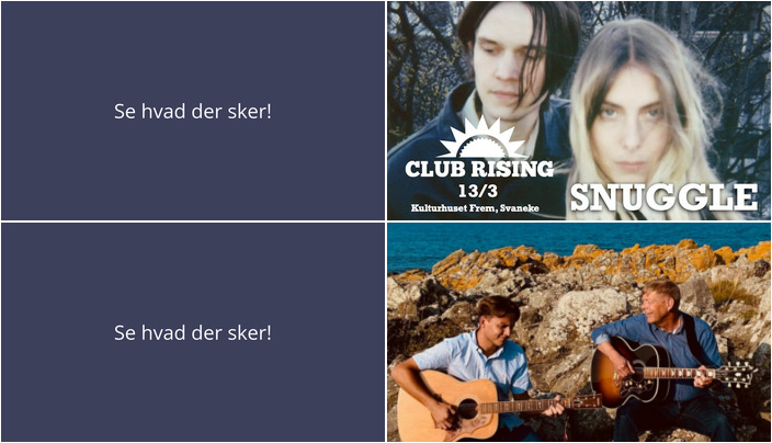 Den kommende weekend i Svaneke lover musikoplevelser for enhver smag. Fredag byder på to interessante koncerter: et dybt kunstnerisk univers a la Snuggle i Kulturhuset Frem og en aften med velkendte danske hits på Svanekegaarden.